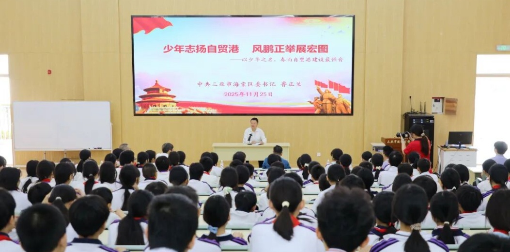 授课中,鲁正兰以党的二十届四中全会精神为指引,立足海南自贸港建设的时代背景,紧扣全岛封关运作关键节点,结合海棠区在现代服务业提质、文旅深度融合等领域的鲜活实践,用详实数据、典型案例深入浅出解读了自贸港建设的重大意义与发展蓝图,激励同学们以青春之朝气、奋斗之姿态,在海南自贸港建设的广阔舞台上绽放少年芳华、书写精彩答卷。