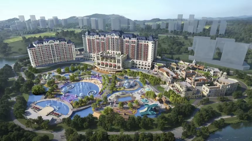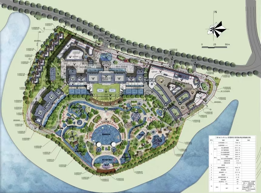项目建设内容包括2栋高层酒店楼、2栋低层酒店楼、1栋酒店配套婚礼广场楼、酒店配套商业街及1座地下室,总建筑面积约11.19万平方米,其中地上(±0以上)建筑面积约8.31万平方米,地下(±0以下)建筑面积约2.88万平方米,项目采用装配式建设拟奖励建筑面积约0.22万平方米,计容建筑面积约7.19万平方米,容积率1.0,建筑密度30%,绿地率40%,建筑层数最高地上14层,地下1层,建筑高度最高51.90米(室外地坪到女儿墙),客房间数499间,机动车停车位469个。