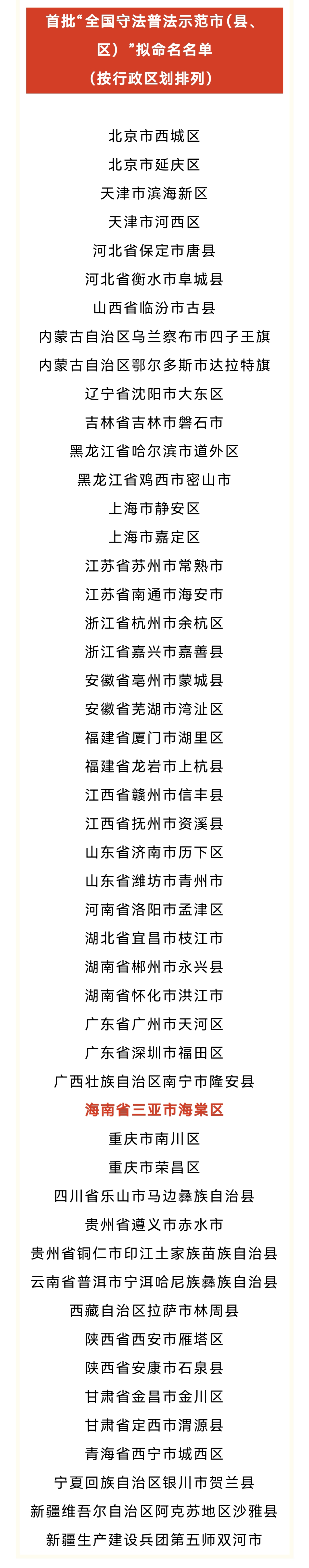 海南省唯一!三亚市海棠区入围首批“全国守法普法示范市(县、区)”公示名单